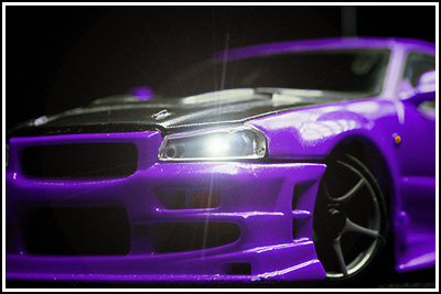 Well for today I think we need something sleek fast and um PURPLE! This is a small R/C car that is about as close as I will ever come to owning a Nissan Skyline. Hope you like it, if you ask really nice I might post what it looked like before I processed it ð